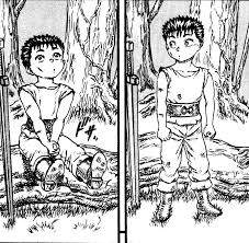O bebê Guts nasceu condenado a morte ali na lama, morreria de inanição ou seria devorado por coiotes, lobos ou cães selvagens. Por sorte foi encontrado por um grupo de mercenários que estava passando por aquela estrada.