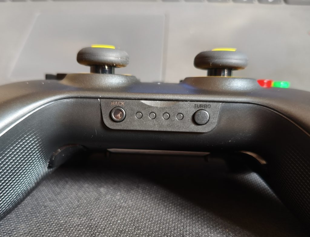 Por fim, na base do controle há luzes indicadoras de pareamento e afins, o botão Back, que serve para navegação (e também para print de tela no Switch), e um botão de aplicação de turbo nos demais botões do controle.