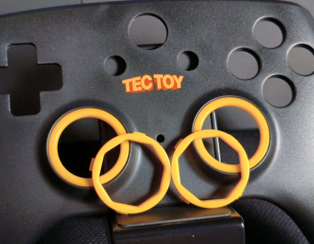 A primeira personalização é a dos restritores do analógico, que são os círculos amarelos da imagem abaixo. Eles ficam presos mecanicamente ao painel frontal do controle e possuem duas opções disponíveis: o restritor redondo e o octogonal.