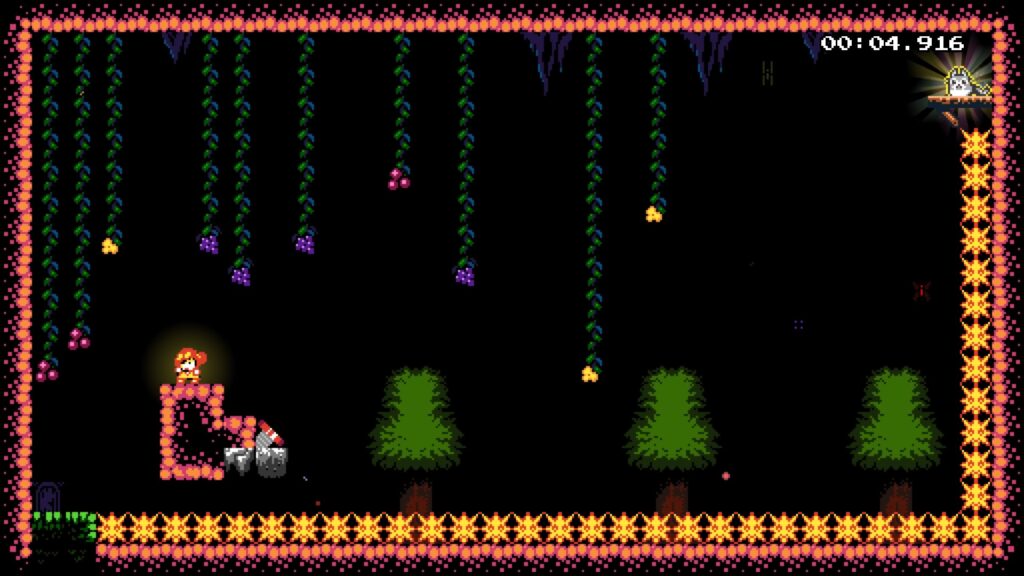 Dito isso, vamos lá. O jogo é um platformer de precisão, mas também dá pra pensar nele como puzzle em algumas instâncias. Você obviamente pode pular e usar uma espécie de dash em oito direções, com esse dash recarregando toda vez que você está em uma plataforma/chão. Saber como, e quando utilizar esse dash, é essencial para passar das 100 fases que compõem a campanha principal do jogo.