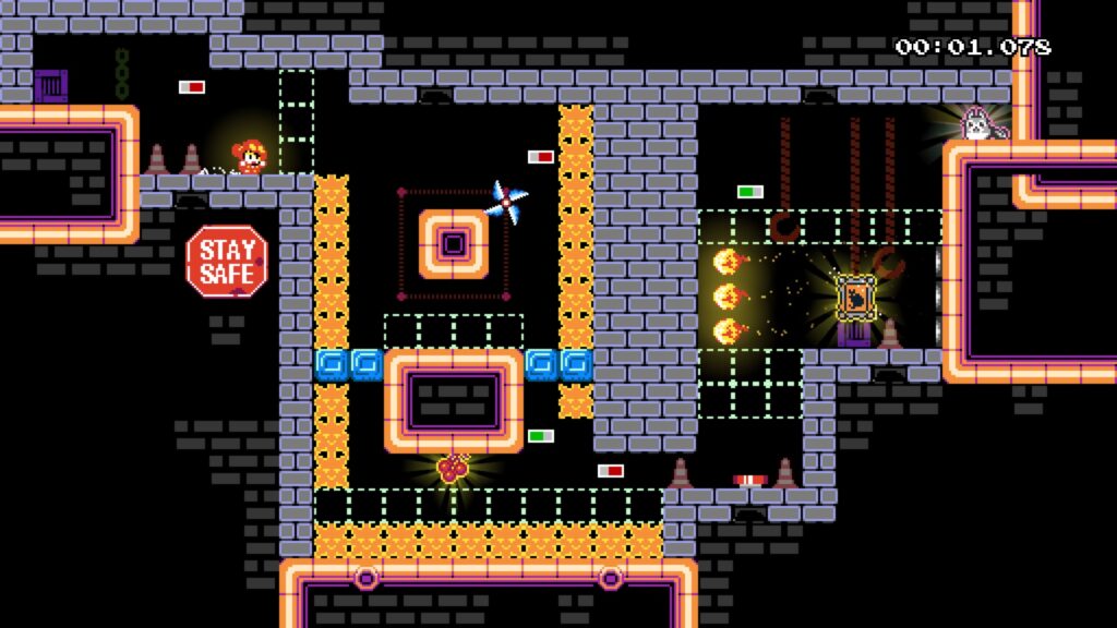 Fora isso, não há muito o que explicar, boa parte das coisas do jogo é auto explicativa, algumas plataformas caem, quase tudo pode te matar, tem alguns switches que mudam o estado de alguns blocos. Enquanto que algumas fases dá pra passar sem precisar nenhum planejamento (exceto a parte de jogar que nem gente), outras fases requerem que você pense um pouco e calcule seus passos.